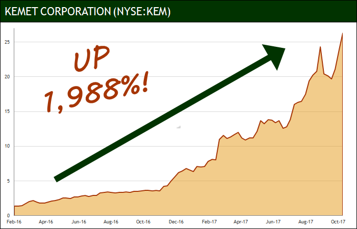 Kemet Corporation... which earned investors an astounding 1,988% gain. That's almost 20 times your money in just 18 months.