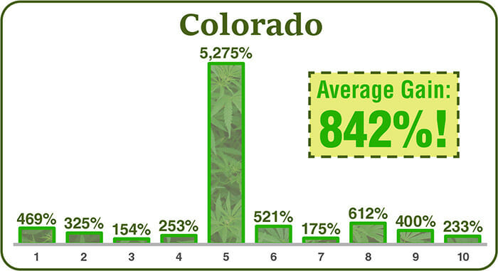 Consider that when Colorado legalized marijuana, investors averaged +842% gains on the top 10 stocks… within the first year alone…