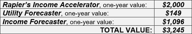 That includes Rapier’s Platinum Income Alliance, along with all our other monthly newsletters, trading services, special reports, and training videos too.