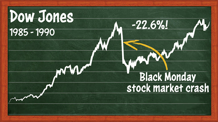 Ending in the 1987 “Black Monday” stock market crash — the largest single-day drop in Dow Jones Industrial Average history.