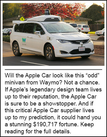 Follow my lead today… and by the time the Apple Car rolls across the stage, your shot at multiplying your money up to 20X will be locked and loaded…