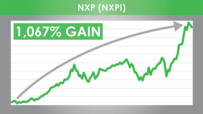 And since becoming a supplier, NXP’s stock has gone on a 1,067% tear.