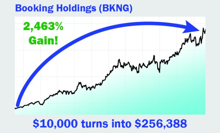 Take the 2,463% profit Booking.com delivered for example. A $10,000 stake would have multiplied into $256,388… Which is an exceptional amount of money. But then again, so is the $38,458 windfall you would have made on a small $1,500 investment. |