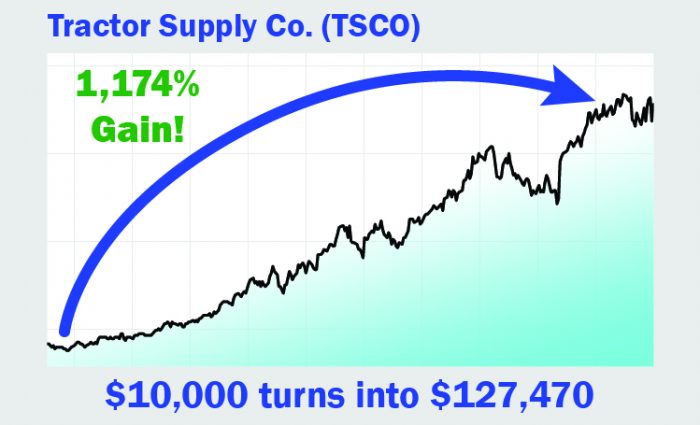 And their stock movements are so erratic – it’s nearly impossible to predict what will happen in the next five minutes… Much less the next few months. They are quite simply – the ultimate stock market gamble. So I decided early on not to look at them when I was creating my system. I wanted it to pinpoint real companies. With real products and services. Well-run operations that are on the cusp becoming everyday names… Sending their stocks parabolic in the process. Like Tractor Supply Company which jumped 1,174%.