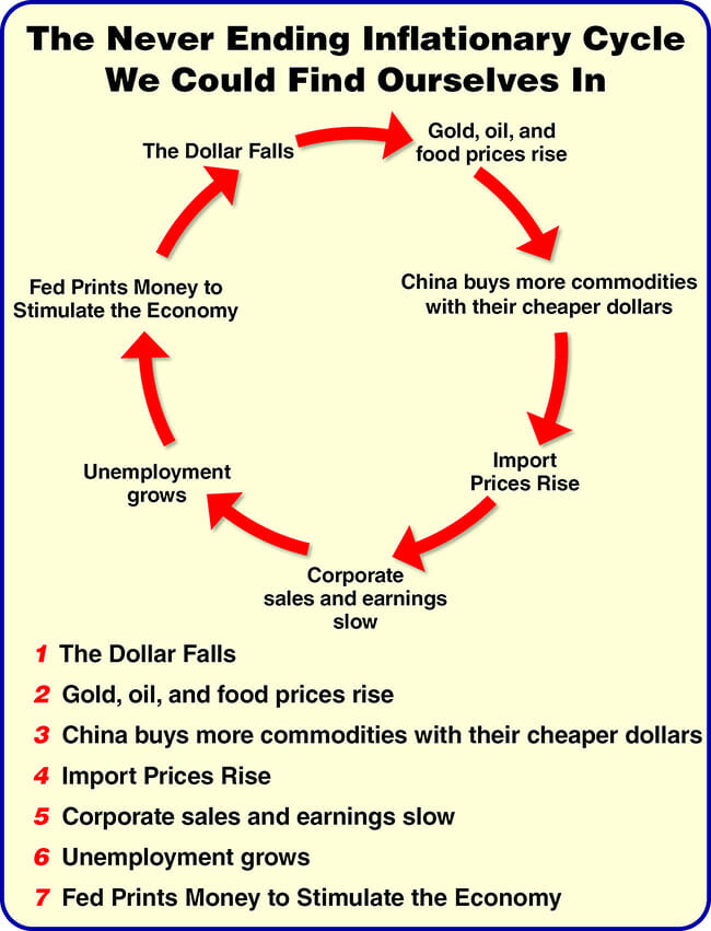 As a result, what we could face is a never-ending inflationary cycle whereby the Fed continues to maintain a very loose monetary policy, the dollar falls lower, commodities rise higher, and the Chinese buy up more commodities on the cheap as our dollar goes down.