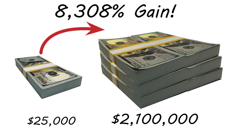 That’s enough to turn a $25,000 stake into $2.1 million.