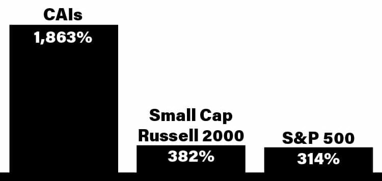 For example — since 2000 these CAIs have posted a 1,863% gain, outperforming the S&P 500 and Russell 2000 by orders of magnitude…